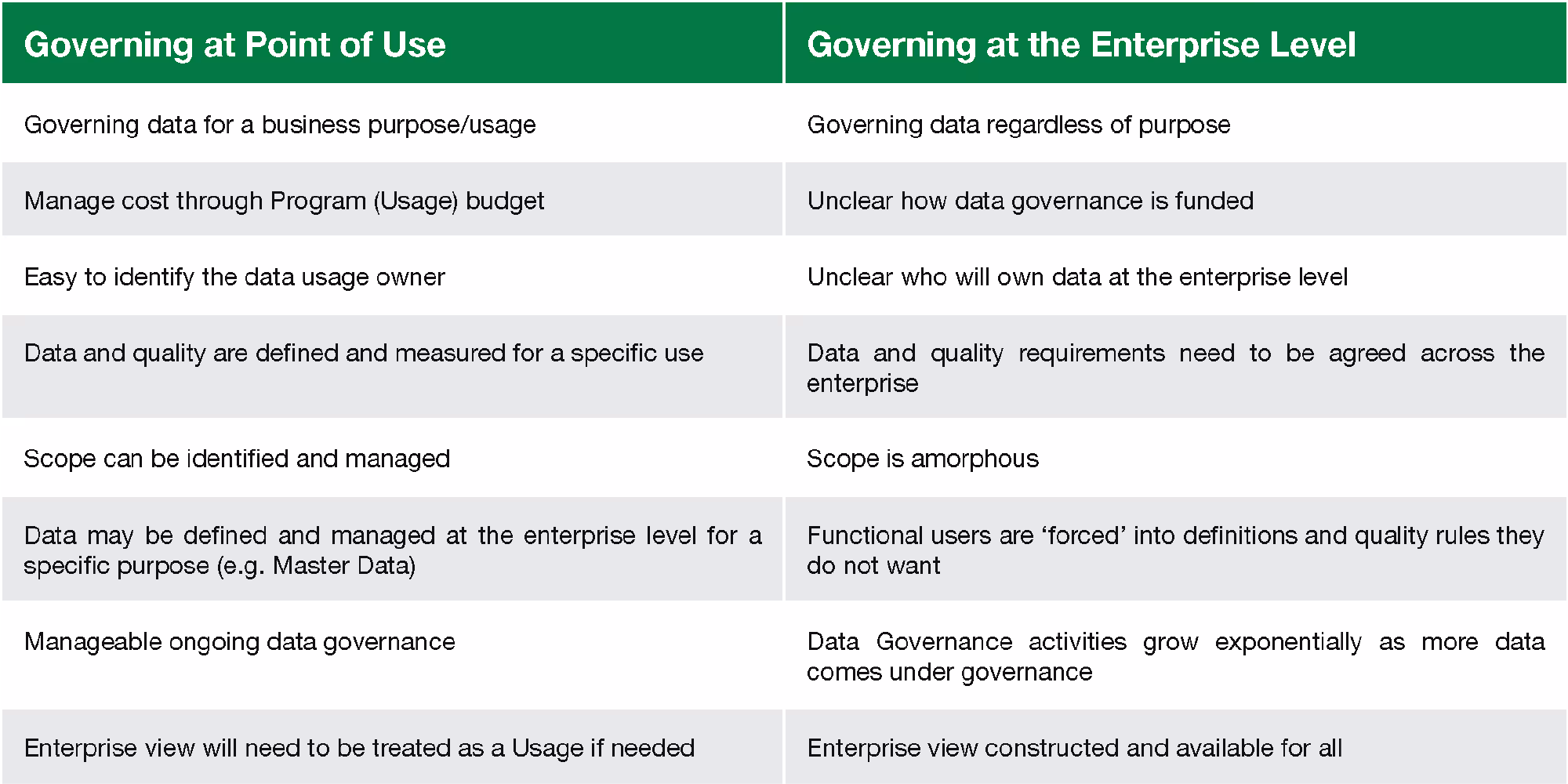 It is important to note the last row in the table. While governing data at the Usage level makes the size, scale and investment more manageable, it does not produce an enterprise view of data, nor does it assign Ownership to a single person. This makes it imperative that other aspects of Data Governance such as cataloging the data and its meaning and usage rules to be of increased importance so that the data is locatable and understandable.