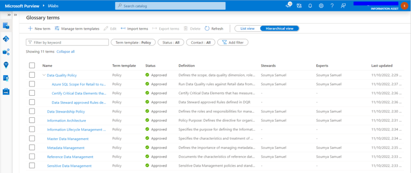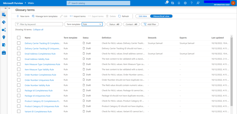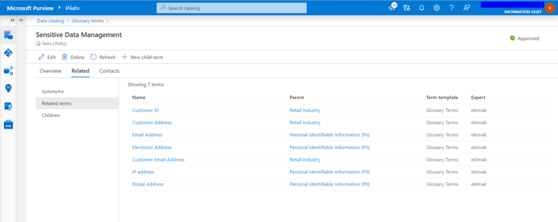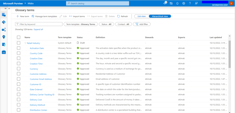 We have built an inventory with over 100 retail glossary terms listed, defined, and enriched with attributes to carry out data governance in Azure Purview. The glossary is described in business terms with a standard format for ease of understanding, whether the consumer of this data is from a business or technical background. Critical Data Elements (CDE's) and Personally Identifiable Information (PII) are identified and tagged accordingly within the glossary (see Figure 1).
