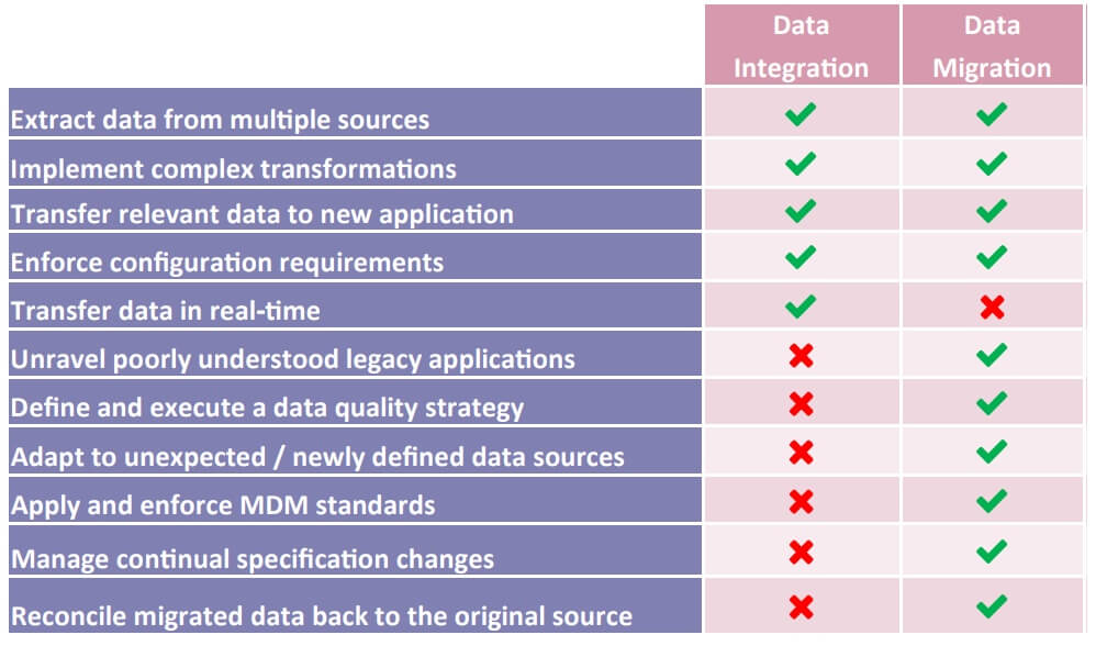 While Data Migration and Data Integration are related, they are two fundamentally different activities with contrasting requirements. They need to be approached as such. When Data Migration is treated like Data Integration, the risk of failure greatly increases. There are several factors which contribute to this reality, but a primary driver is a failure to use tools specifically tailored to meet the unique needs of Data Migration.