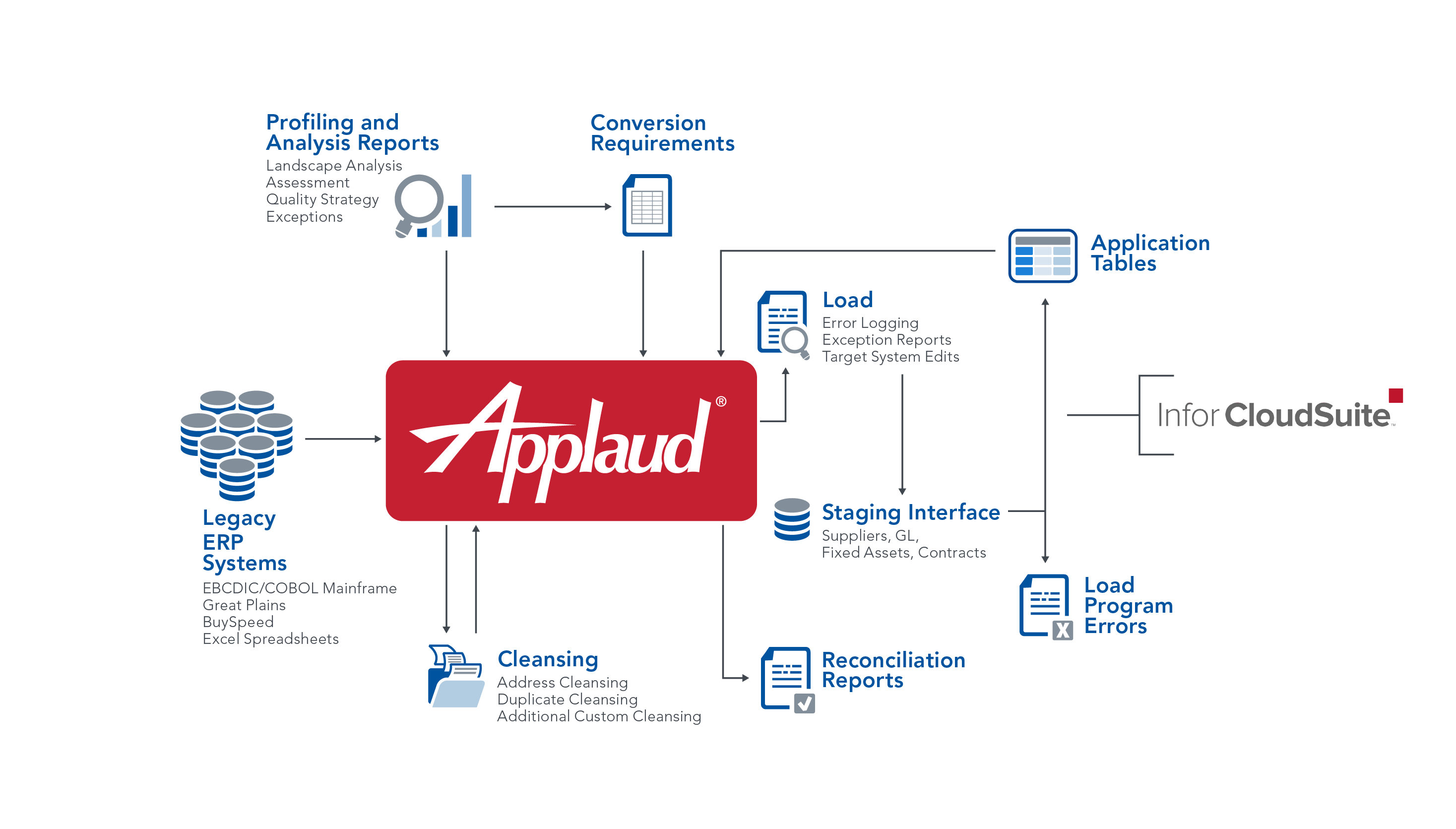 - Premier’s data migration software, Applaud®: Applaud has been optimized to address the challenges that occur on data migration projects, allowing the team to accomplish all data needs using one integrated product.