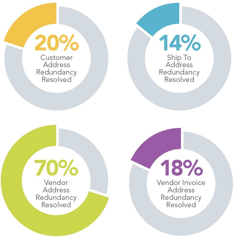 Definian’s solution identified and corrected for a 20% Customer Address redundancy rate and a 70% Vendor Address redundancy rate. Contact information, shipping instructions, and credit notes were successfully merged underneath the surviving Business Partner as part of the migration to SAP.