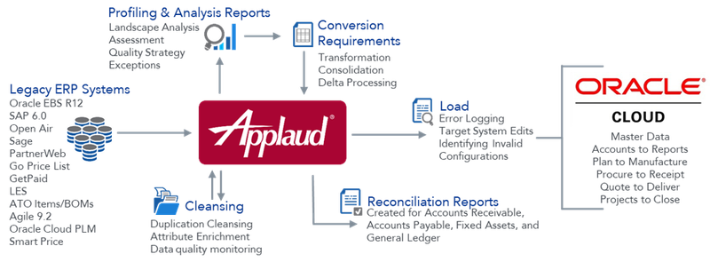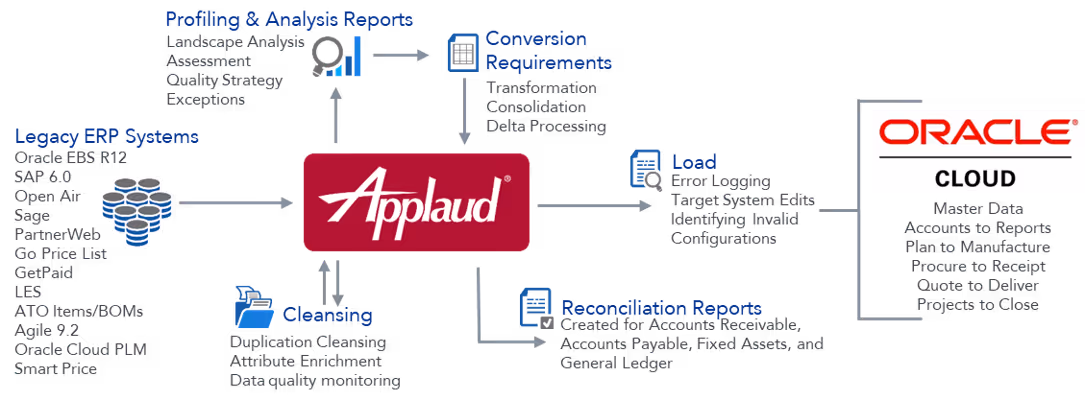 - Leveraged Applaud’s ability to create customized reconciliation reports that could track records from the Legacy aging reports, through the conversion process, and into the final Cloud loads. This ensured that the Client had a full financial reconciliation between the legacy and target systems in preparation for go-live.