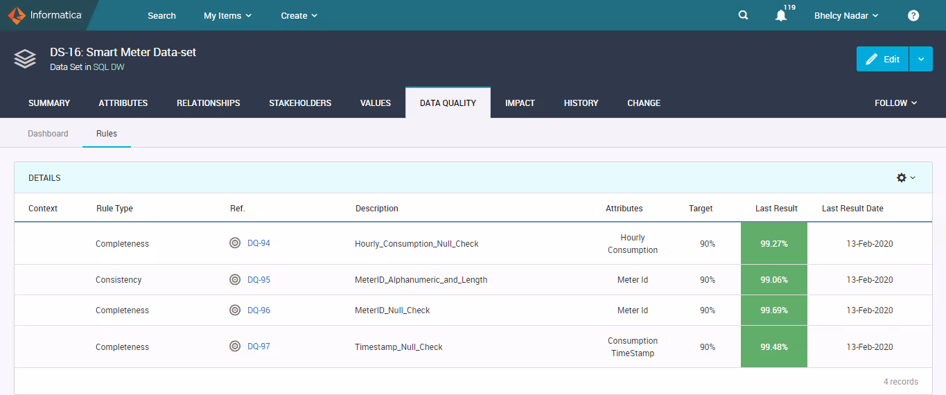 One of the most important functions of smart meters is the recording of hourly consumption done by the consumer. This data is essential as the supply of electricity can be monitored. By using Informatica Big Data Quality we can profile the dataset and execute technical data quality rules to monitor and identify exceptions within the data sets. The technical data quality rule defined in Informatica Data Quality has an expression defined to validate the data. This rule is related to the local data quality rule created in Informatica Axon where the results will be updated based on the schedule. If there happens to be an outage in the supply the data quality rule will recognize the exception. This is further updated in the local data quality rule of Informatica Axon. Based on the change in result a workflow will be triggered to notify the steward about the exception occurred. Figure 4, shows the exceptions generated in Informatica's Data Quality platform.