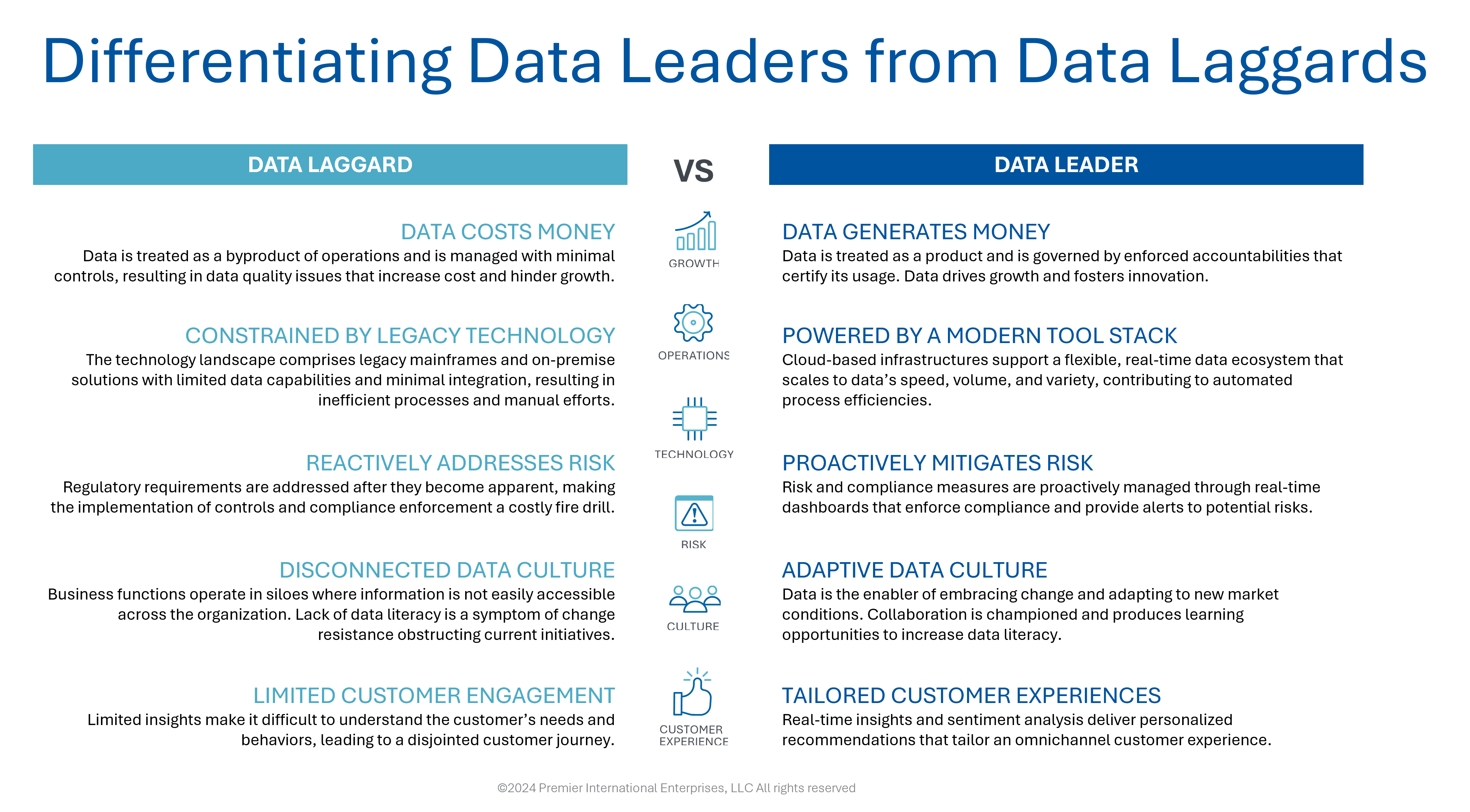 The journey from being a data laggard to becoming a data leader requires a fundamental shift in culture, technology, risk management, customer engagement, and data valuation. Organizations that embrace these changes can unlock the full potential of their data, transforming it from a byproduct into a strategic asset that drives growth, innovation, and competitive advantage. By understanding and implementing the strategies of data leaders, businesses can position themselves at the forefront of the digital economy, ready to navigate the complexities of the modern market with agility and confidence.